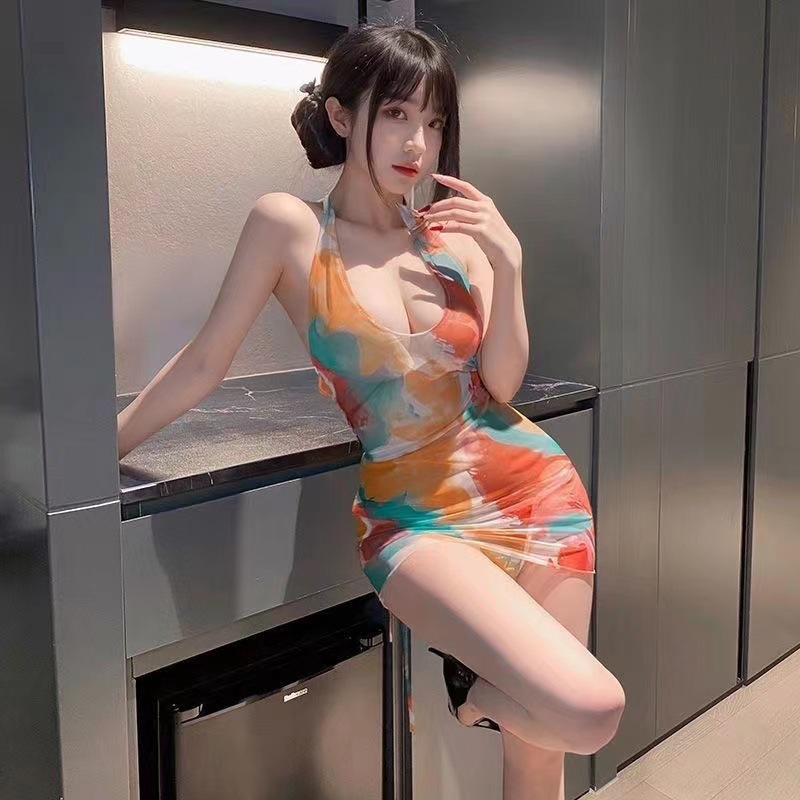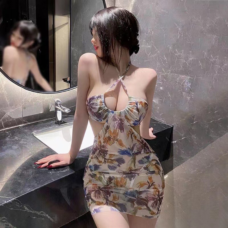 Chiyuge shallow deep U-shaped exposed groove blurred printing hip skirt sexy lingerie summer sexy bare back dress 2593