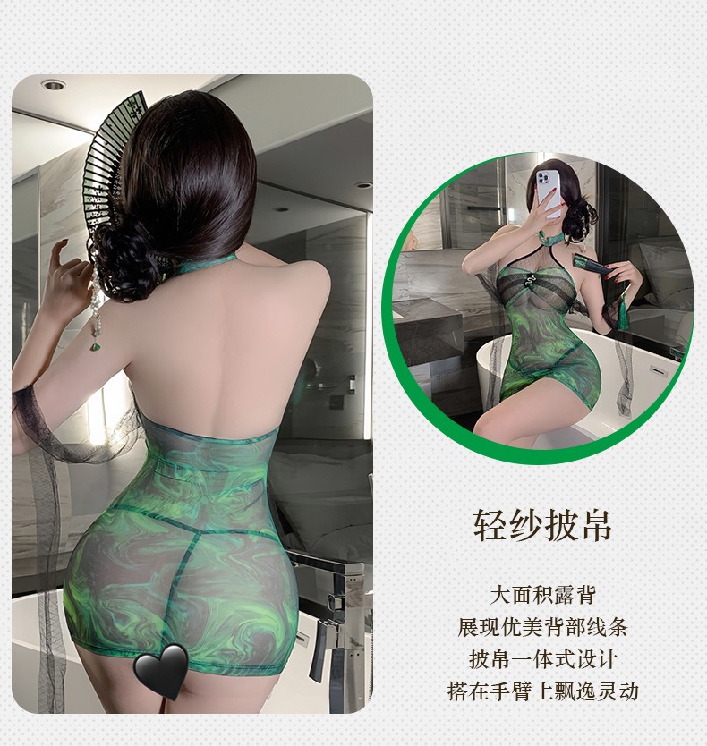 Green Snake Cheongsam Sexy Stand Collar Halter Neck See-Through Hip Nightdress 2727